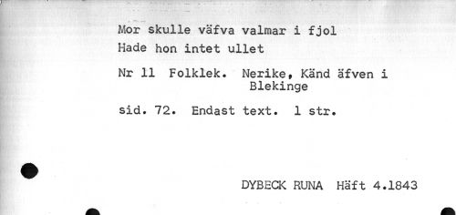 //// t //// Mor skulle väfva valmar i fjol Hade hon intet ullet //// Nr 11 Folklek. Nerike* Känd äfven i //// Blekinge //// sid. 72. Endast text. 1 str. ^ DYBECK RUNA Häft 4.1843 //// r , ////