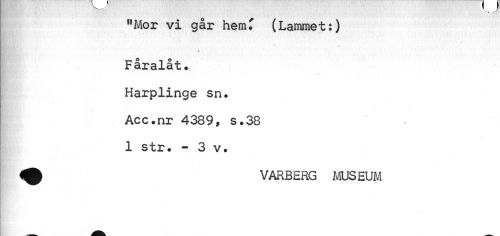//// V*. //// "Mor vi går hem T (Lammet:) //// K'"; ' « > //// Fåralåt• Harplinge sru Acc.nr 4389, s.38 1 str. - 3 v. //// VARBERG MUSEUM ////