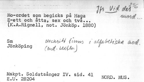 //// - ¦ " IftJiiM^ 1 //// Mo-ordet som begicks på Haga .,_ //// E-ett och åtta, sex och tva... (K.A.Rignell, not. Jönköp. 1880) //// Sm UiakAiJJ (il^yto ( xlUMi^ké, //// Jönköping m^J //// % //// Mskpt. Soldatsånger IV. sid. 41 HnDn 1!IIC; ////