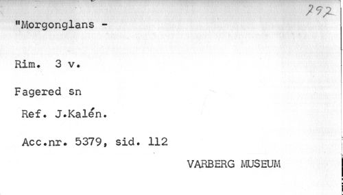 //// / 7 A //// "Morgonglans - //// Rim. 3 v. //// Fagered sn Ref. J.Kålen. //// r //// C //// Acc.nr. 5379, sid. 112 //// j //// * i //// VARBERG MUSEUM ////