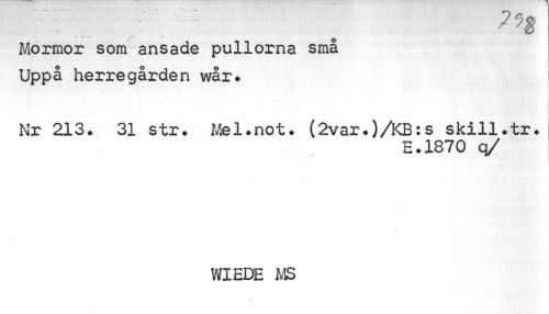 //// Mormor som ansade pullorna små //// Uppå herregården wår# //// ¦ //// ! //// . . • ... . ' . //// L //// r //// { //// Nr 213. 31 str. Mel.not. (2var.)/KB:s skill.tr. //// E.1870 q //// /WIEDE MS ////