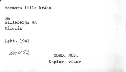 //// Mormors lilla kråka Sm* //// Hälleberga sn Målerås //// Lekt. 1941 //// NORD. MUS? Kopior visor ////