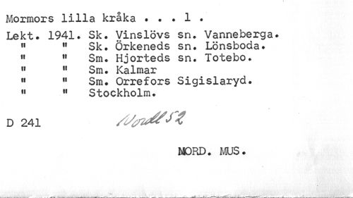 //// Mormors lilla kråka . . . 1 . //// Lekt. 1941. Sk. Vinslövs sn. Vanneberga. //// 11 11 Sk. Örkeneds sn. Lönsboda. //// 11 11 Sm. Hjorteds sn. Totebo. 11 11 Sm. Kalmar //// 11 11 Sm. Orrefors Sigislaryd. //// 11 " Stockholm. //// D 241 A/& //// MORD. MUS. ////