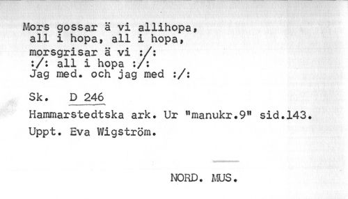 //// t //// Mors gossar ä vi allihopa, all i hopa, all i hopa, //// morsgrisar ä vi :/: :/: all i hopa :/: Jag med. och jag med :/: //// Sk. D 246 //// i ni //// Hammarstedtska ark. Ur f,manukr.9!l sid. 143. Uppt. Eva Wigström. //// NORD. MUS. ////