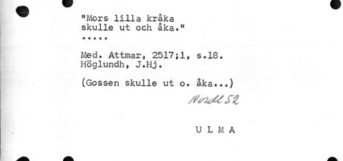 //// ^ "Mors lilla kråka //// skulle ut och åka." //// Med. Attmar, 2517;1, s.18. Höglundh, J.Hj. //// (Gossen skulle ut o. åka...) //// //// /U L M A //// i //// Ml ^H Hfc i ////