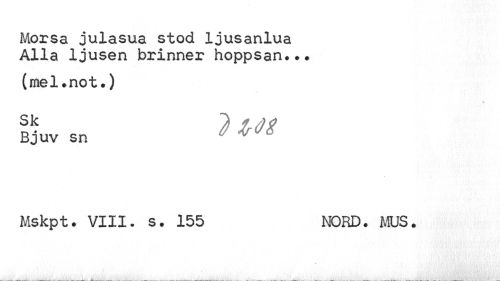 //// Morsa julasua stod ljusanlua Alla ljusen brinner hoppsan... //// (mel.not.) //// ljuv sn ? *** //// Mskpt. VIII. s. 155 NORD. MUS. ////