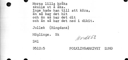 //// A Morsa lilla kraka //// skulle ut å åka. Inge hade han till att köra, än så bar det hit och än så bar det dit och än så bar det ned i dikit. //// Jullek (Ringdans) //// Höglinge. Sk . //// 3512:5 FOLKLIVSARKIVET LUND ////
