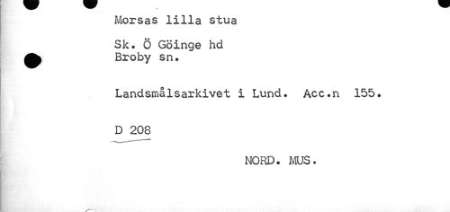 //// Morsas lilla stua //// Sk. Ö Göinge hd //// •i Broby sn. //// //// /Landsmålsarkivet i Lund. Acc.n 155. D 208 //// NORD. MUS. ////