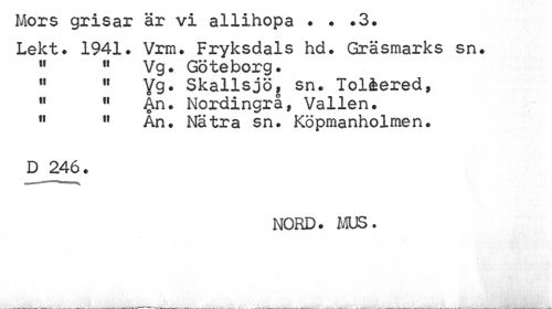 //// Mors grisar ar vi allihopa . . .3. //// Lekt. 1941. Vrm. Fryksdals hd. Gräsmarks sn. //// M " Vg. Göteborg. //// w 11 yg. Skallsjö, sn. Tolåered, //// 11 H £n. Nordingrå, Vallen. //// " 11 An. Nätra sn. Köpmanholmen. //// D 246. //// NORD. MUS. ////
