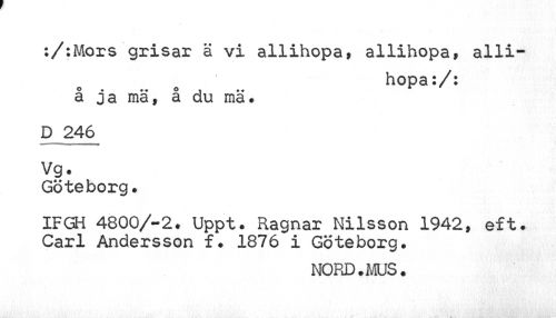 //// :/:Mors grisar ä vi allihopa, allihopa, allihopa:/: //// å ja mä, å du mä. D 246 //// •mmv^^B—BrneimmiBimmmmmmmmmF //// Vg. //// Göteborg. //// IFGH 4800/-2. Uppt. Ragnar Nilsson 1942, eft. Carl Andersson f. 1876 i Göteborg. //// NORD.MUS. ////