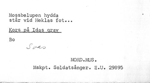 //// Mossbelupen hydda står vid Heklas fot... //// Kors på Idas grav //// Bo //// S //// NORD. MUS. Mskpt. Soldatsånger. E.U. 29895 ////