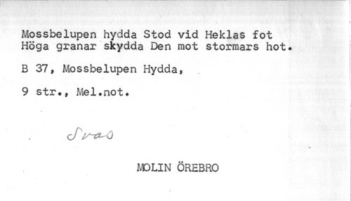 //// I //// Mossbelupen hydda Stod vid Heklas fot //// Höga granar skydda Den mot stormars hot. f //// B 37, Mossbelupen Hydda, 9 str., Mel.not. //// } //// i I //// • i //// ¦ //// c/V**-^ //// MDLIN ÖREBRO ////