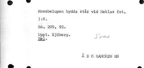 //// Mossbelupen hydda står vid Heklas fot, 1:8. //// R6, 205, 92. //// Upp t. Sjöberg. J>~o' //// Mel. ° //// » //// ÅBO RANCKEN MS ////