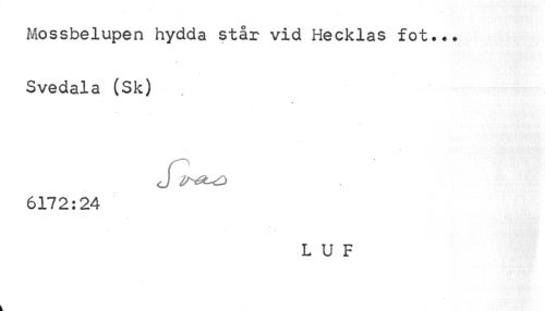 //// Mossbelupen hydda står vid Hecklas fot... //// i //// Svedala (Sk) //// <J inst^s //// 6172:24 //// L U F ////