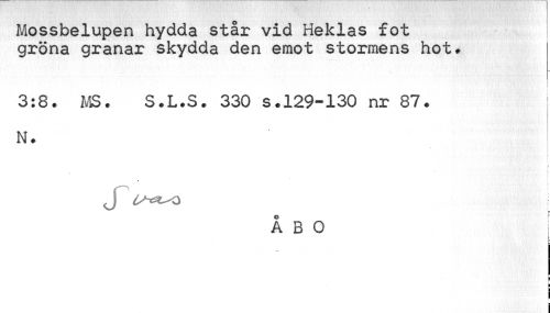 //// Mossbelupen hydda står vid Heklas fot gröna granar skydda den emot stormens hot. //// 3:8. MS. S.L.S. 330 s.129-130 nr 87. N. //// i i* t //// I //// b //// J //// ÅBO j //// b //// i | //// ¦ i ////
