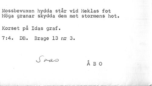 //// Mossbevuxen hydda står vid Heklas fot Höga granar skydda dem mot stormens hot. //// Korset på Idas graf. 7:4. DB. Brage 13 nr 3. //// O //// A B O //// i ////