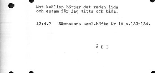 //// •ti //// f Mot kvällen börjar det redan lida //// och ensam får jag sitta och bida, //// 12:4.? SSenssons saml.häfte Nr 16 s.133-134. //// ÅBO //// * jk ////