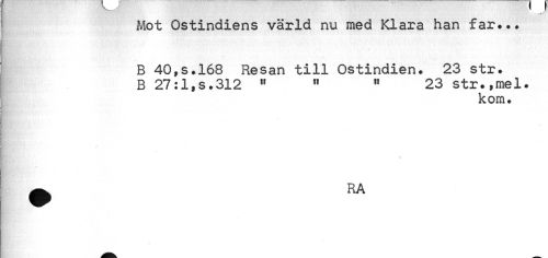 //// 1 //// Mot Ostindiens värld nu med Klara han far... //// B 40,s.168 Resan till Ostindien. 23 str. B 27:1,s.312 » « « 23 str.,mel. //// kom. //// % ////
