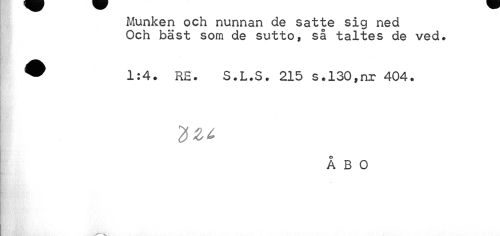 //// Munken och nunnan de satte sig ned Och bäst som de sutto, så taltes de ved. //// ® 1:4. RE. S.L.S. 215 s.130,nr 404. //// ÅBO ////