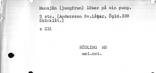 //// Munsjön (jungfrun) löser på sin pung. 2 str. (Andersson Sv.Lå$ar, Ögld.339 //// Skänklåt.) s 231 //// SÖDLING MS //// m:' //// •mel.not. ////