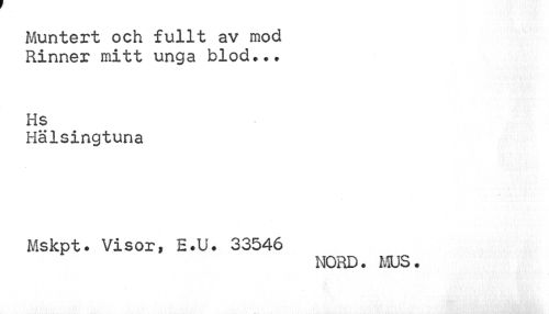 //// Muntert och fullt av mod Rinner mitt unga blod... //// Hs //// Hälsingtuna //// Mskpt. Visor, E.U. 33546 //// NORD. MUS. ////