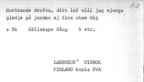 //// Ok* //// Muntrande drufva, ditt lof vill jag sjunga gledje på jorden ej fins utom dig //// s 56 Sällskaps Sång 5 str. //// LASENIUS' VISBOK 1 //// F //// FINLAND kopia SVA //// i //// i //// E ¦ //// I ////
