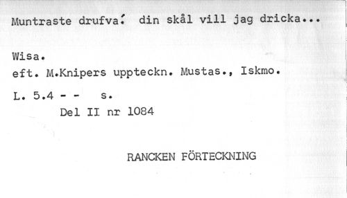 //// Muntraste drufva' din skål vill jag dricka... //// Wisa. i //// ef t. M.Knipers uppteckn. Mustas., Iskmo. //// i //// S, 'fe ; i //// L• 5.4 - - s. //// r //// Del II nr 1084 //// V //// I //// RANCKEN FÖRTECKNING //// * ////