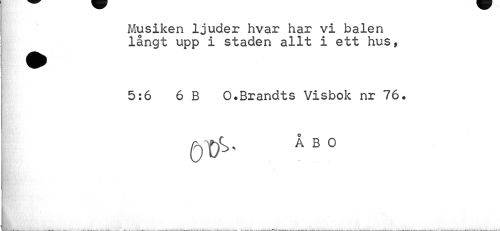 //// Musiken ljuder hvar har vi balen långt upp i staden allt i ett hus, //// 5:6 6 B O.Brandts Visbok nr 76. //// ÅBO ////