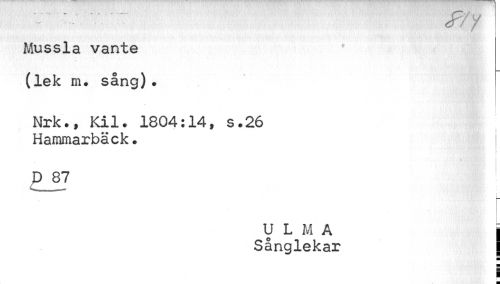 //// "" " y/y //// Mussla vante (lek m. sång). //// Nrk., Kil. 1804:14, s.26 Hammarbäck. //// P87 //// U L M A j //// Sånglekar | //// I ////
