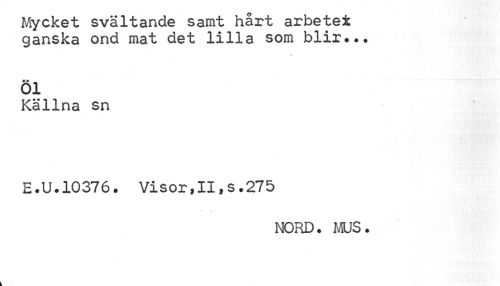 //// Mycket svältande samt hårt arbetet ganska ond mat det lilla som blir*.. //// Öl //// Källna sn //// E.U.10376. VisortII,s.275 //// NORD. MUS. ////