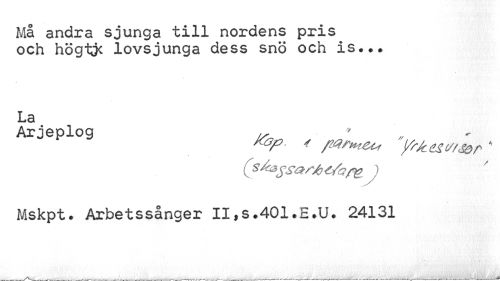 //// Må andra sjunga till nordens pris och högtjc lovsjunga dess snö och is... //// La //// Arjeplog * //// 4 /Wmeor yrJt£S<//£ör k //// Mskpt. Arbetssånger II,S.401.E.U. 24131 ////