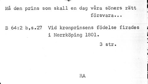 //// Må den prins som skall en dag våra söners rätt ! //// m //// försvara... //// r //// B 64:2 b,s.27 Vid kronprinsens födelse firades } //// i Norrköping 1301. S //// 3 str. : //// RA | //// i i ////