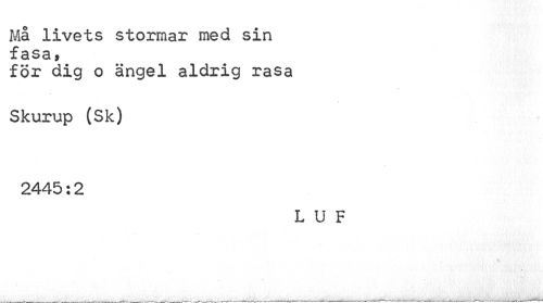 //// Må livets stormar med sin //// fasa, //// för dig o ängel aldrig rasa Skurup (Sk) //// 2445:2 //// L U F //// . y1 • ////