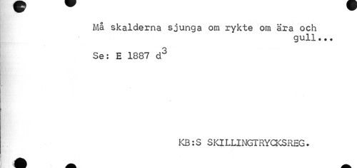 //// Må skalderna sjunga om rykte om ära och //// gull... //// Se: E 1887 d3 //// KB:S SKILLINGTRYCKSREG. ////
