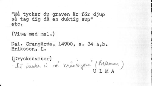 //// I //// I //// "Ma tycker du graven är för djup i //// så tag dig då en duktig sup" //// etc* ; //// (Visa med mel.) P //// ¦ //// ¦ i //// Dal. Grangärde, 14900, s. 34 a,b. ! //// Eriksson, L. f //// (Dryckesvisor) , „ . f I //// Ir ^ V W^ur*a (MAm**) | //// U L M A ////