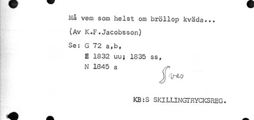 //// Må vem som helst om bröllop kväda... (Av K.F.Jacobsson) //// Se: G 72 a,b, //// E 1832 uu; 1835 ss, N 1845 a //// J //// KB:S SKILLINGTRYCKSREG. ////