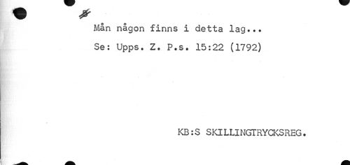 //// Mån någon finns i detta lag... Se: Upps. Z. P.s. 15:22 (1792) //// * //// KB:S SKILLINGTRYCKSREG. ////