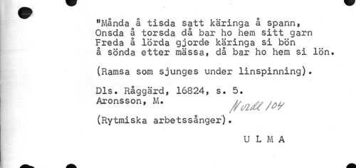 //// "Månda å tisda satt käringa å spann, Onsda å torsda då bar ho hem sitt garn Freda å lörda gjorde käringa si bön å sönda etter mässa, då bar ho hem si lön* //// (Ramsa som sjunges under linspinning). //// Dis. Råggärd, 16824, s. 5. Aronsson, M. //// (Rytmiska arbetssånger). //// U L M A ////