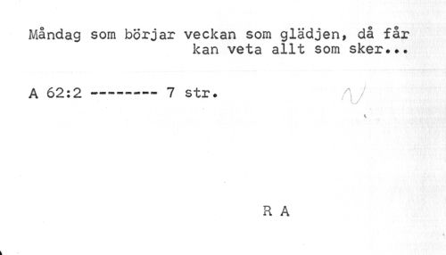 //// Måndag som börjar veckan som glädjen, då får //// kan veta allt som sker... //// A 62:2...7 str. f\j //// R A ////