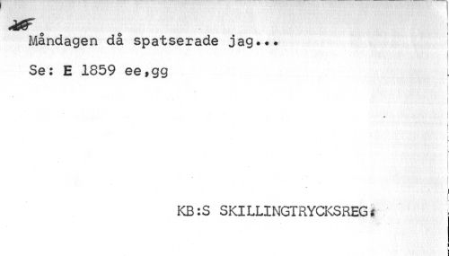 //// o //// Måndagen då spatserade jag... //// i //// Se: E 1859 ee,gg //// i //// • « //// « ! //// t //// i //// » //// i f //// i //// I //// ¦ //// [ //// KB:S SKILLINGTRYCKSREG < i //// i ////
