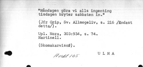 //// .... — ..... . . ... //// "Måndagen göra vi alls ingenting tisdagen bryter sabbaten in." //// I | (Jfr Grip, Sv. Allmogeliv, s. 216 /Endast //// detta/) . //// Upl. Nora, 303:934, s. 74. Martineli. //// (Skomakarvisof). //// /Passos- ULMA ////