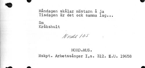 //// Måndagen skålar mästarn å ja Tisdagen är det ock samma lag*** //// Sm //// Kråkshult //// NORD. MUS. //// Mskpt. Arbetssånger I,s. 312. E.U. 19658 //// 04 V' . ////
