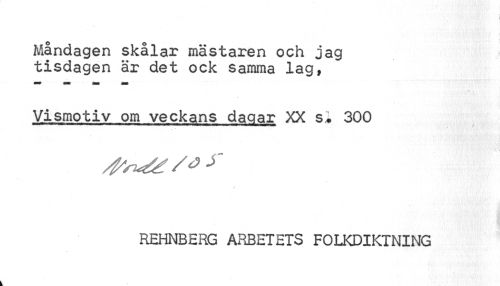 //// I //// I //// ' « //// Måndagen skålar mästaren och jag tisdagen är det ock samma lag, //// > //// Vismotiv om veckans dagar XX s« 300 //// i //// i //// REHNBERG ARBETETS FOLKDIKTNING ////