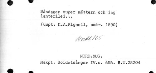 //// Måndagen super mastern och jag lanterilej... //// (uupt. K.A.Rignell, omkr. 1890) //// NORD.MUS. //// Mskpt. Soldatsånger IV.s. 655. E.U.28204 ////