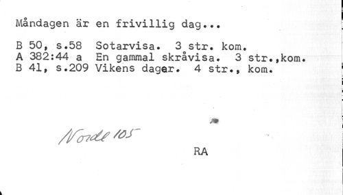 //// Måndagen är en frivillig dag... //// B 50, s.58 Sotarvisa. 3QStr. korn. A 382:44 a En gammal skråvisa. 3 str.,kom. //// B 41, s.209 Vikens dager. 4 str., kom. j //// ¦ //// i //// s //// r //// I //// s i //// i r //// i i- //// m | //// RA ////