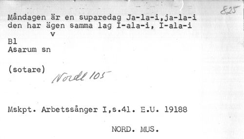 //// ;; ....." . &JS' //// Måndagen är en suparedag Ja-la-i,ja-la-i den har ägen samma lag I-ala-i* I-ala-i | //// v //// Bl //// Asarum sn //// t //// (sötare) //// /iTcndf Ml //// Mskpt. Arbetssånger I,s.41. E.U. 19188 //// i //// NORD. MUS. ////