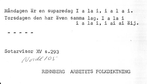 //// Måndagen är en suparedag I a la i, i al ax. //// Torsdagen den har även samma lag» I a la i //// i a la i» i ai ai äij* //// Sotarvisor XV s.293 //// REHNBERG ARBETETS FOLKDIKTNING ////