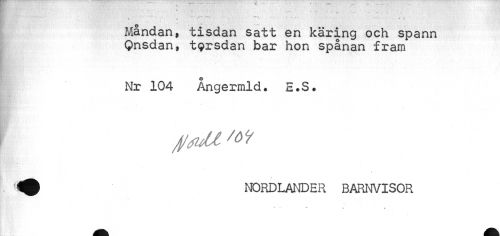 //// . . ¦ .. ...... //// — \ . • - • . , - //// 0 * //// Mandan, tisdan satt en käring och spann Qnsdan, t<?rsdan bar hon spånan fram //// Nr 104 Ångermld. E.S. //// /t/äuU w //// . ^ NORDLANDER BARNVISOR //// ¦¦ ¦«= » . f. ////