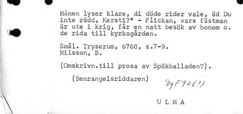 //// Månen lyser klare, di döde rider vale, äd Du inte rädd, Kersti?" - Flickan, vars fästman ^ är ute i krig, får en natt besök av honom o. //// de rida till kyrkogården. //// Smål. Tryserum, 6768, s.7-9. Nilsson, B. //// (Omskrivn.till prosa av Spökballaden?)? //// (Be nrange1sridd are n) ^ ; //// .2 //// \\ U L M A ////