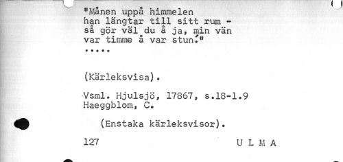 //// "Månen uppå himmelen //// han längtar till sitt rum - //// så gör väl du å ja, min vän //// var timme å var stun^11 | * • • # • //// (Kärleksvisa) ? //// •Vsml. Hjulsjö, 17867, s.18-1.9 Haeggblom, C. //// Rt^fc (Enstaka kärleksvisor). //// 127 U L M A ////